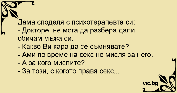 Жінка у психотерапевта: - Лікарю, я не можу зрозуміти, чи кохаю я свого чоловіка. - А чому ви в цьому сумніваєтеся? - Тому що під час сексу я завжди думаю не про нього. - А про кого? - Про того, з ким у даний момент займаюся сексом.
