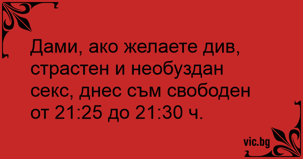 Дами, ако желаете див, страстен и необуздан cekc, днес съм свободен от 21:25 до 21:30 ч.