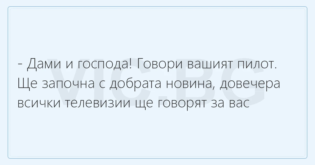 - Дами и господа! Говори вашият пилот. Ще започна с добрата новина, довечера всички телевизии ще говорят за вас