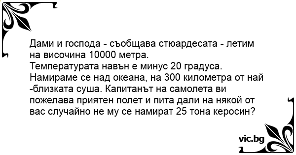 Температурата навън е минус 20 градуса. Намираме се над океана, на 300 километра от най-близката суша. Капитанът на самолета ви пожелава приятен полет и пита дали на някой от вас случайно не му се намират 25 тона керосин?