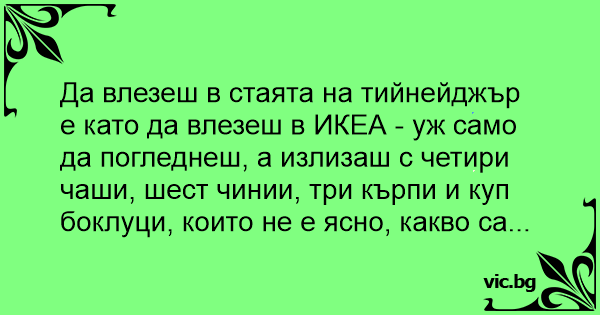 Да влезеш в стаята на тийнейджър е като да влезеш в ИКЕА - уж само да погледнеш, а излизаш с четири чаши, шест чинии, три кърпи и куп боклуци, които не е ясно, какво са...