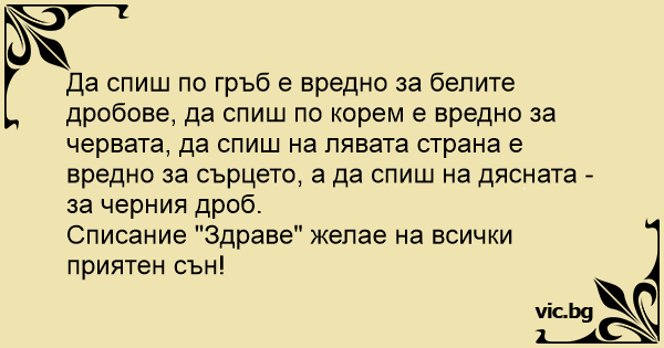 Да спиш по гръб е вредно за белите дробове, да спиш по корем е вредно за червата, да спиш на лявата страна е вредно за сърцето, а да спиш на дясната - за черния дроб.