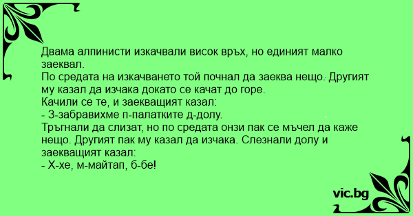 По средата на изкачването той почнал да заеква нещо. Другият му казал да изчака докато се качат до горе.