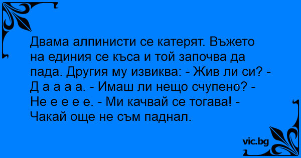 Двама алпинисти се катерят. Въжето на единия се къса и той започва да пада. Другия му извиква: - Жив ли си? - Д а а а а. - Имаш ли нещо счупено? - Не е е е е. - Ми качвай се тогава! - Чакай още не съм паднал.