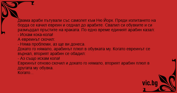 Двама араби пътували със самолет към Ню Йорк. Преди излитането на борда се качил евреин и седнал до арабите. Свалил си обувките и си размърдал пръстите на краката. По едно време единият арабин казал: