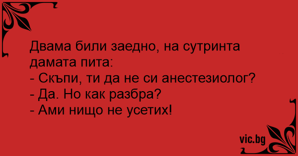 Nākamajā rītā pēc pirmās nakts. Viņa: ?Kāda īsti ir tava profesija?? Viņš: ?Anesteziologs.? Viņa: ?Tagad skaidrs, kāpēc es neko nejutu.?