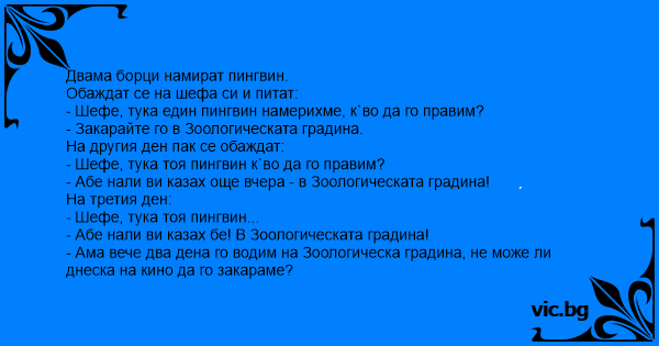 - Шефе, тука един пингвин намерихме, к`во да го правим?