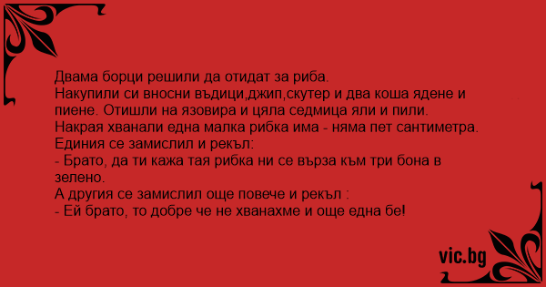 - Брато, да ти кажа тая рибка ни се върза към три бона в зелено.