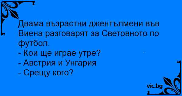 "Grandpa, grandpa! I'm watching a soccer game!" Grandpa: "Who's playing?" Grandson: "Austria-Hungary." Grandpa: "Against who?"