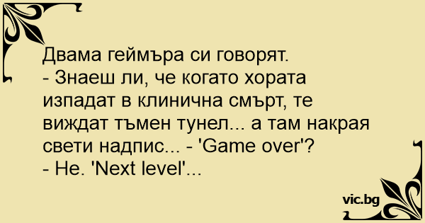 - Знаеш ли, че когато хората изпадат в клинична смърт, те виждат тъмен тунел... а там накрая свети надпис... - 'Game over'?