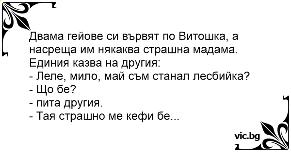 Двама гейове си вървят по Витошка, а насреща им някаква страшна мадама.