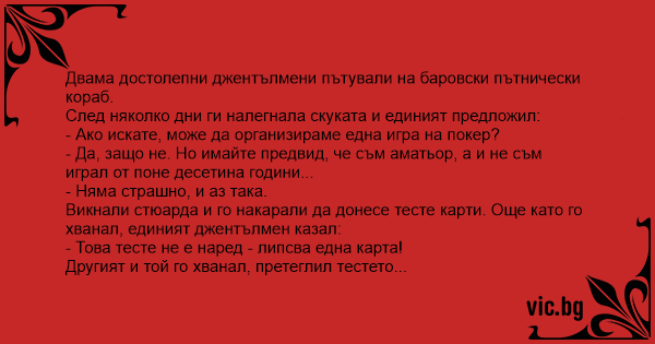 Викнали стюарда и го накарали да донесе тесте карти. Още като го хванал, единият джентълмен казал: