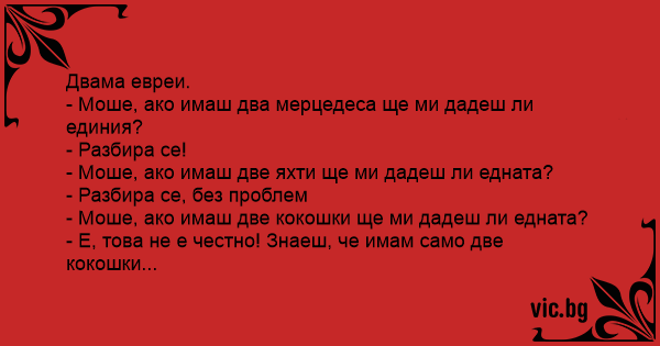 - Моше, ако имаш две кокошки ще ми дадеш ли едната?