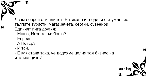 Двама евреи отишли във Ватикана и гледали с изумление тълпите туристи, магазинчета, сергии, сувенири.
