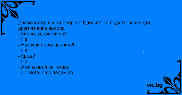 Két hegymászó kalandozik a Himalája szikláin, mikor egyikük egy szakadékba esik. A társa utánakiált: - Nem ütötted meg magad? - Nem. - Kezed, lábad nem tört el? - Nem. - Akkor gyere, mássz ki és...
