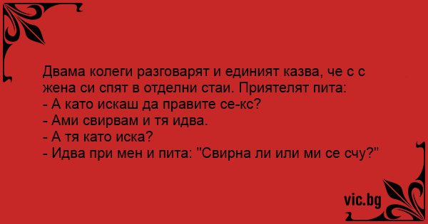 - Hogyan éltek házaséletet, ha külön szobában alusztok? - érdeklődik a barátnő. - Ez nálunk igen egyszerűen megy, a férjem füttyent egyet, ha kedve van hozzá. - És, ha neked támad kedved? - Akkor...