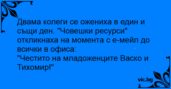 Двама колеги се ожениха в един и същи ден. "Човешки ресурси" откликнаха на момента с е-мейл до всички в офиса: