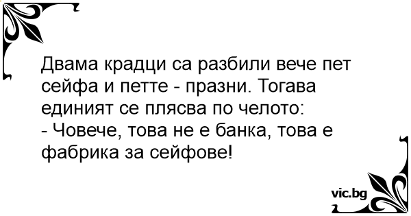 Двама крадци са разбили вече пет сейфа и петте - празни. Тогава единият се плясва по челото: