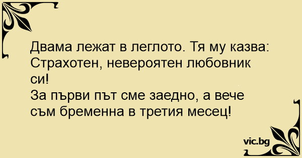 - Скъпи, ти си невероятен - възкликва в леглото млада дама - За първи път сме заедно, а аз вече съм бременна в третия месец!