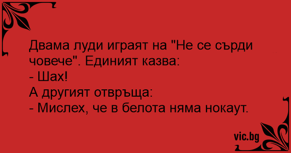 Двама луди играят на "Не се сърди човече". Единият казва:
