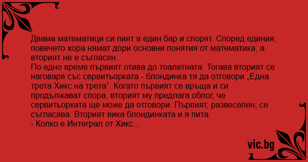 Двама математици си пият в един бар и спорят. Според единия, повечето хора нямат дори основни понятия от математика, а вторият не е съгласен.