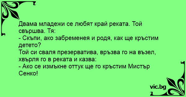После водење љубов девојката прашува: Ако после ова оставам трудна и родам дете како ќе го крстиме? Дечкото го вади презервативот го врзува во чвор и го фрла низ прозор: Ако после ова родиш дете,...