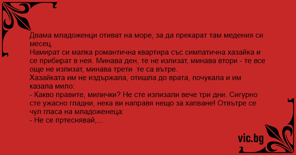 - Какво правите, милички? Не сте излизали вече три дни. Сигурно сте ужасно гладни, нека ви направя нещо за хапване! Отвътре се чул гласа на младоженеца: