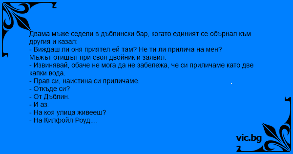 Двама мъже седели в дъблински бар, когато единият се обърнал към другия и казал: