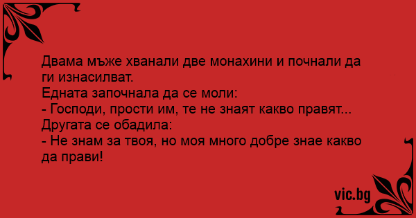 Twee nonnen lopen door een donker steegje en worden plotseling gegrepen door twee mannen. Terwijl ze wordt verkracht, kijkt een van de nonnen naar de hemel en roept: "God vergeef hen. Zij weten... Två nunnor strosar genom en mörk gränd då två stora män hoppar fram och börjar våldta dem. Den första nunnan tittar upp mot himlen och skriker. - Förlåt dem fader, ty de vet ej vad de gör. Den... Dos monjitas están siendo violadas, y una de ellas exclama: - Padre, perdónalo, porque no sabe lo que hace! A lo que la otra responde: - No generalizes, que el mío sí que sabe! Dos violadores que ingresan al convento Santa Clara, y a las dos primeras monjas que las encuentran a su paso las violan, de inmediato. - Una de las monjas mirando al cielo: Perdónalo Señor, no sabe lo que hace. -Replicando la otra monja: Eso será el tuyo porque el mío es un experto. Two nuns are walking back to the convent at night when two men push them into a dark alley and start having sex with them. 2 monjas que las estan violando a la vez. Двама изнасилват две монахини. Едната казва: Er lopen twee nonnen door een donkere steeg. Plotseling worden ze overvallen door twee wilde mannen en voor ze het weten liggen ze naakt op de grond. Zegt de ene non tegen de andere: “Oh God... Zwei Nonnen werden auf dem Weg ins Kloster von zwei Burschen belästigt. "Herr, ruft die eine, vergib ihnen, denn sie wissen nicht, was sie tun!" "Still, zischt da die andere, meiner weiß es!" Estas son 2 monjas que ivan por la calle y le saltan 2 atracadores, al ver que no tenian dinero decidieron violarlas. Una de las monjas se pone a gritar-Hayy dios mioo!! perdonales no saben lo... Dos monjas en el amazonas, las capturan y violan los nativos: - Perdónales Señor, porque no saben lo que hacen, dice una monja. - Será el tuyo, porque el mío es un experto, dice la otra. Het is avond en twee nonnen lopen samen naar de kerk. Ineens worden ze door 2 mannen een steegje ingetrokken. De mannen beginnen de nonnen te betasten en voordat de nonnen het beseffen worden ze...