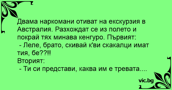 Двама наркомани отиват на екскурзия в Австралия. Разхождат се из полето и покрай тях минава кенгуро. Първият: