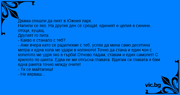 - Ами вчера като се раделихме с теб, успях да мина само десетина метра и една кола ме удари в коляното! Точно да стана и един кон с копитото ме удря яко в гърба! Отново падам, ставам и един самолет! С крилото по шията. Едва не ми откъсна главата. Вдигам си главата и бам една ракета точно между очите!