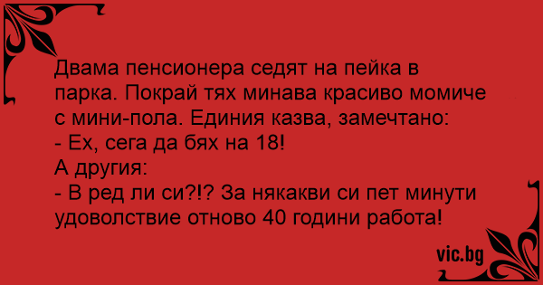 Двама пенсионера седят на пейка в парка. Покрай тях минава красиво момиче с мини-пола. Единия казва, замечтано: