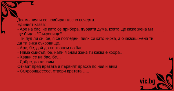 - Ти луд ли си, бе, я се погледни, пиян си като кирка, а очакваш жена ти да ти вика съкровище…