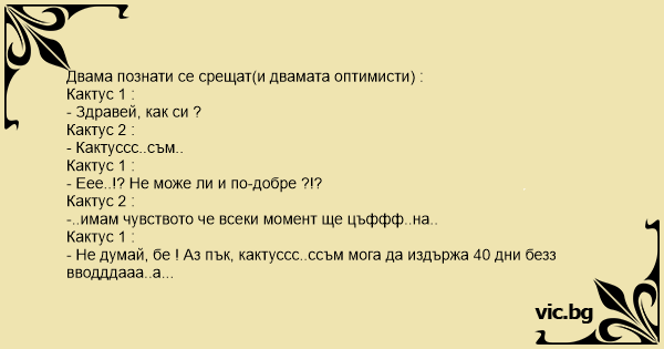 - Не думай, бе ! Аз пък, кактуссс..ссъм мога да издържа 40 дни безз вводддааа..а !
