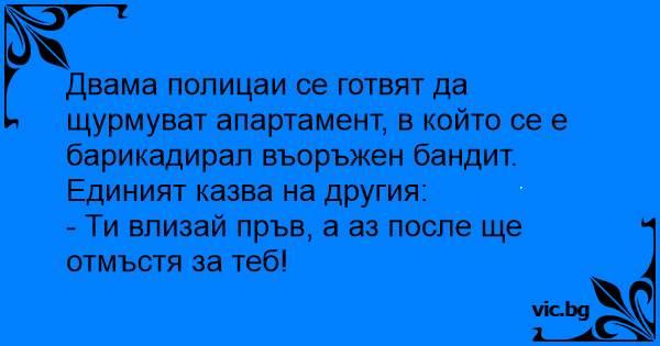 Divi policisti stāv pie dzīvokļa durvīm, kurā slēpjas bīstams recidīvists. Viens saka: - Ej pirmais, es tevi atriebšu.
