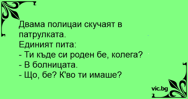Разговараат двајца полицајци и едниот го прашува другиот: - Каде си ти роден? - Дома, а ти? - Јас, во болница. - Зошто бе, што ти било?