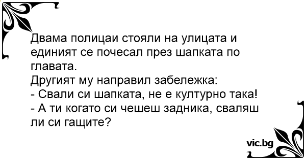 Двама полицаи стояли на улицата и единият се почесал през шапката по главата.