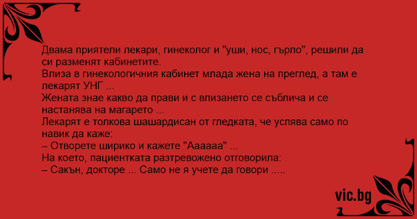 Двама приятели лекари, гинеколог и "уши, нос, гърло", решили да си разменят кабинетите.