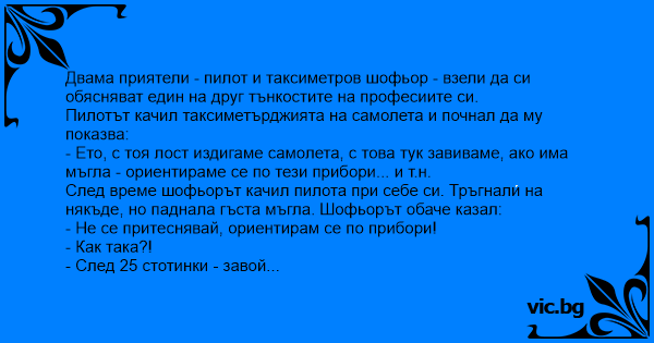 Двама приятели - пилот и таксиметров шофьор - взели да си обясняват един на друг тънкостите на професиите си.