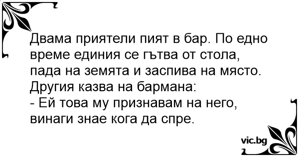 Двама приятели пият в бар. По едно време единия се гътва от стола, пада на земята и заспива на място. Другия казва на бармана:
