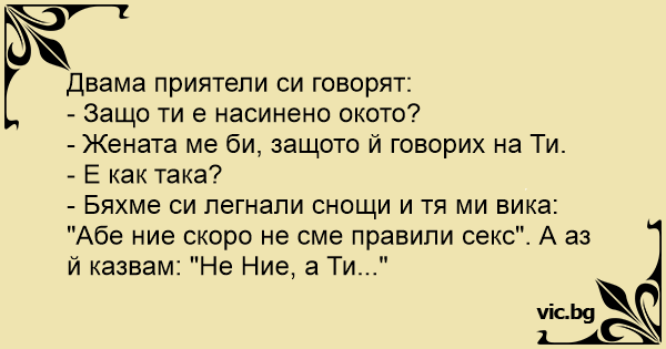 - Бяхме си легнали снощи и тя ми вика: "Абе ние скоро не сме правили cekc". А аз й казвам: "Не Ние, а Ти..."