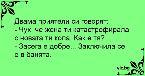 - Ало братучед, разбрав жена ти ја слупала колата. Да не е повредена? - Уште не е. Се заклучила во бањата… Разбрах, че жена ти катастрофирала с новата ви кола...