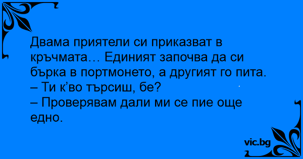 Двама приятели си приказват в кръчмата… Единият започва да си бърка в портмонето, а другият го пита.