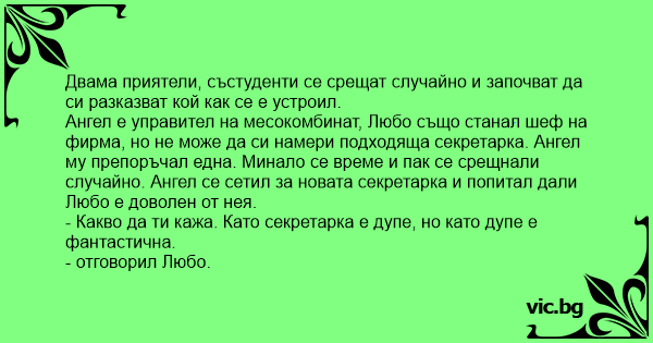 Ангел е управител на месокомбинат, Любо също станал шеф на фирма, но не може да си намери подходяща секретарка. Ангел му препоръчал една. Минало се време и пак се срещнали случайно. Ангел се сетил за новата секретарка и попитал дали Любо е доволен от нея.