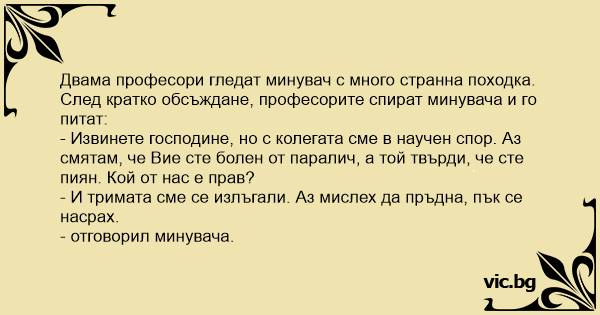 - Извинете господине, но с колегата сме в научен спор. Аз смятам, че Вие сте болен от паралич, а той твърди, че сте пиян. Кой от нас е прав?