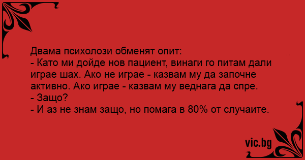 - Като ми дойде нов пациент, винаги го питам дали играе шах. Ако не играе - казвам му да започне активно. Ако играе - казвам му веднага да спре.