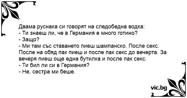 - Ми там със ставането пиеш шампанско. После cekc. После на обяд пак пиеш и после пак cekc до вечерта. За вечеря пиеш още една бутилка и после пак cekc.