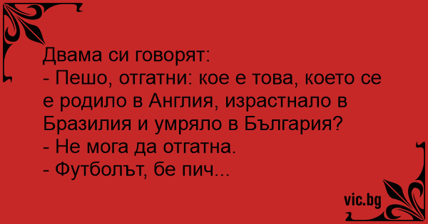 - Пешо, отгатни: кое е това, което се е родило в Англия, израстнало в Бразилия и умряло в България?