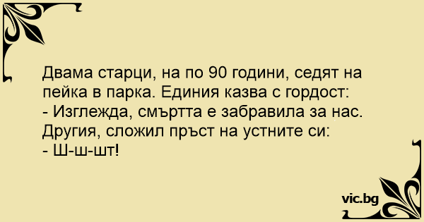 Двама старци, на по 90 години, седят на пейка в парка. Единия казва с гордост: