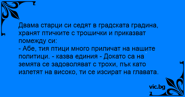 - Абе, тия птици много приличат на нашите политици. - казва единия - Докато са на земята се задоволяват с трохи, пък като излетят на високо, ти се изсират на главата.